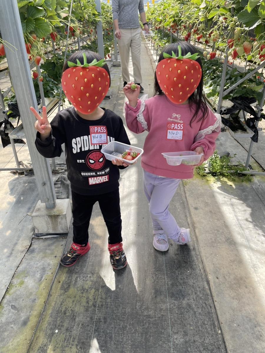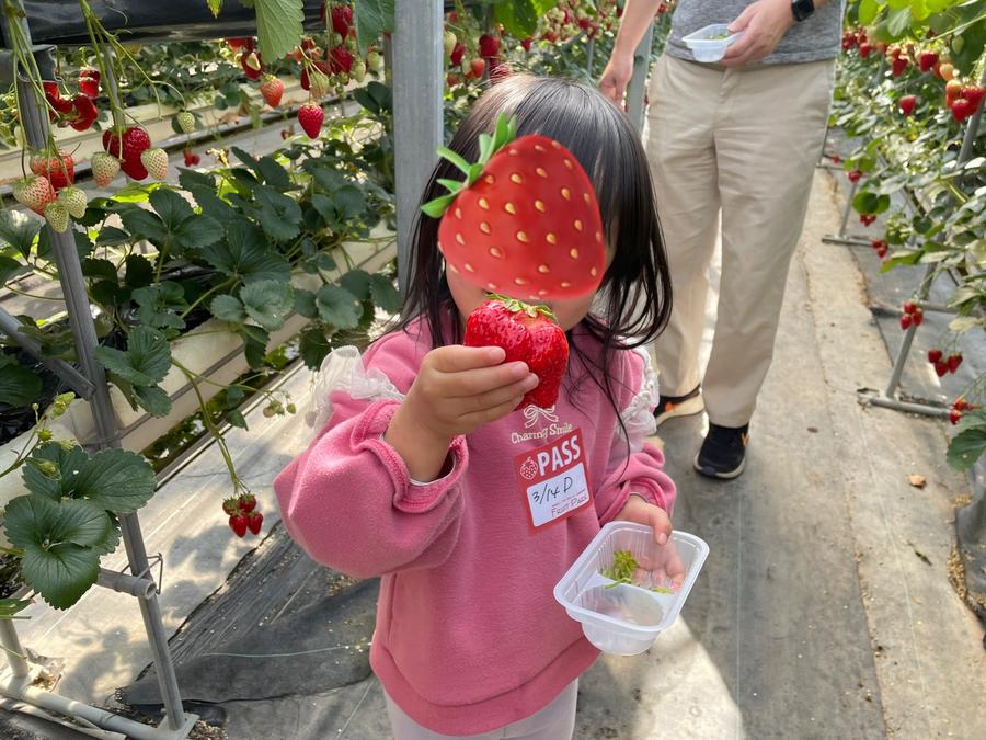 6種類のいちごの食べ比べができる巨大ビニールハウスで30分間のいちご狩りを満喫しました。どのいちごも美味しかったです。 家族で「わたしは『はるひ』が好き」「ぼくは『章姫』!」と会話が弾みました。 30分は短いかなと思いきや、ちょうど良かったです。 スタッフさんに声をかけると練乳のおかわりをもらえます。たっぷりめがいいですか~?と優しく聞いてくれました。 いちごの棚が2段になっているので大人も子供も取りやすいです。 ハウス内に蜂が居て少し怖かったですが、広いので他の棚へ移動すれば問題なかったです。